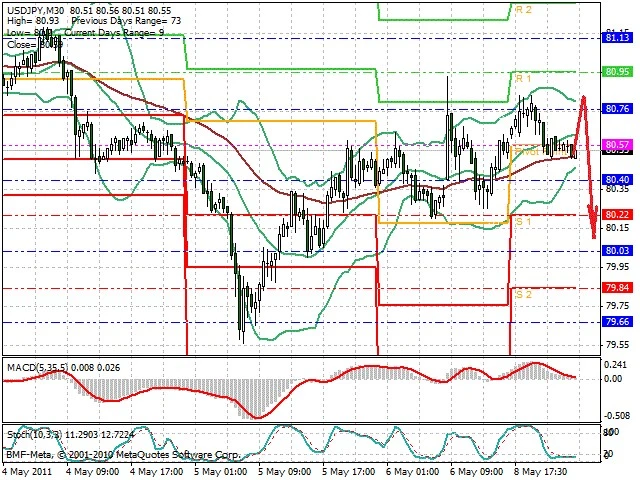 Předpokládaný pohyb pro dnešní den SHORT. Případné vstupy do obchodu z hladiny 80.8 s předpokládaným cílem 80.1, případně až 79.9. Proražení hladiny 80.9 může vést k pohybu s pravděpodobným cílem 81.3 až 81.7.