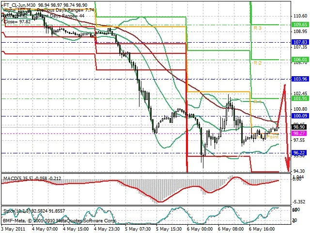 Předpokládaný pohyb pro dnešní den SHORT. Případné vstupy do obchodu z hladiny 103 s předpokládaným cílem 94.7, případně až 92.2. Proražení hladiny 103 může vést k pohybu s pravděpodobným cílem 105 až 106.1.