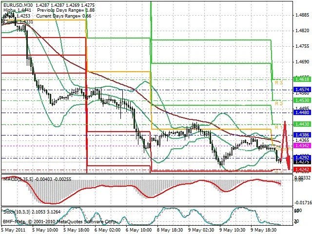 Předpokládaný pohyb pro dnešní den SHORT. Případné vstupy do obchodu z hladiny 1.4445 s předpokládaným cílem 1.425, případně až 1.416. Proražení hladiny 1.4445 může vést k pohybu s pravděpodobným cílem 1.451 až 1.4575.