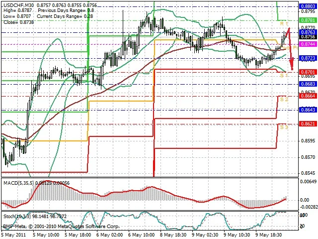 Předpokládaný pohyb pro dnešní den SHORT. Případné vstupy do obchodu z hladiny 0.877 s předpokládaným cílem 0.8705, případně až 0.8675. Proražení hladiny 0.877 může vést k pohybu s pravděpodobným cílem 0.88 až 0.8835.