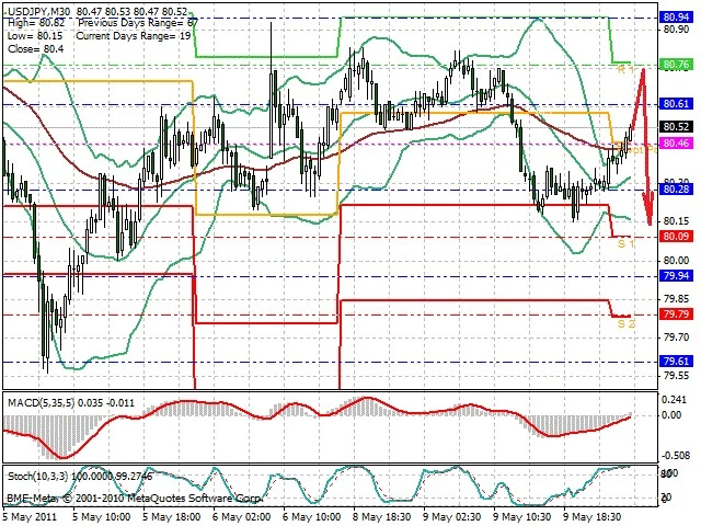 Předpokládaný pohyb pro dnešní den SHORT. Případné vstupy do obchodu z hladiny 80.75 s předpokládaným cílem 80.15, případně až 79.85. Proražení hladiny 80.85 může vést k pohybu s pravděpodobným cílem 81.3 až 81.7.
