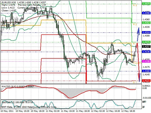 Předpokládaný pohyb pro dnešní den SHORT. Případné vstupy do obchodu z hladiny 1.427 s předpokládaným cílem 1.412, případně až 1.409. Proražení hladiny 1.428 může vést k pohybu s pravděpodobným cílem 1.4325 až 1.435.