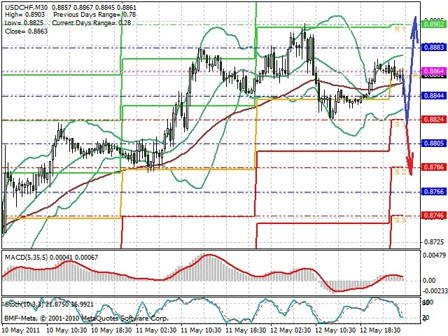 Předpokládaný pohyb pro dnešní den LONG. Případné vstupy do obchodu z hladiny 0.882 s předpokládaným cílem 0.8905, případně až 0.895. Proražení hladiny 0.882 může vést k pohybu s pravděpodobným cílem 0.8785 až 0.876.