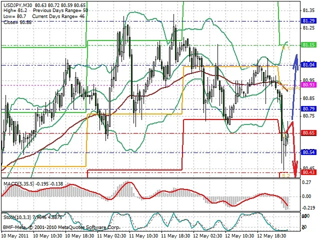 Předpokládaný pohyb pro dnešní den SHORT. Případné vstupy do obchodu z hladiny 80.7 s předpokládaným cílem 80.38, případně až 80.15. Proražení hladiny 80.8 může vést k pohybu s pravděpodobným cílem 81.1 až 81.35.