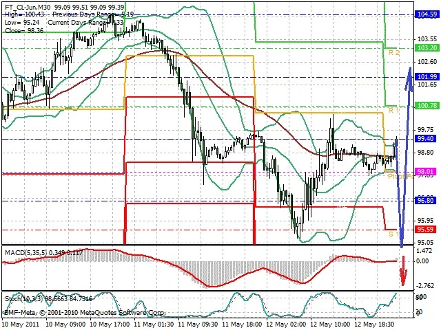Předpokládaný pohyb pro dnešní den LONG. Případné vstupy do obchodu z hladiny 94.9 s předpokládaným cílem 102.3, případně až 104.75. Proražení hladiny 94.9 může vést k pohybu s pravděpodobným cílem 93.4 až 92.1.