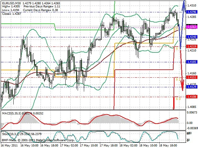 Předpokládaný pohyb pro dnešní den LONG. Případné vstupy do obchodu z hladiny 1.4215 s předpokládaným cílem 1.434, případně až 1.438. Proražení hladiny 1.4205 může vést k pohybu s pravděpodobným cílem 1.4125 až 1.4085.
