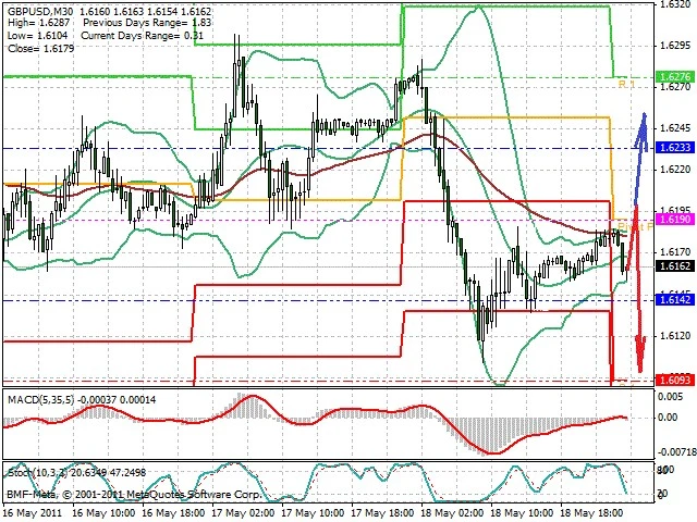Předpokládaný pohyb pro dnešní den SHORT. Případné vstupy do obchodu z hladiny 1.62 s předpokládaným cílem 1.61, případně až 1.607. Proražení hladiny 1.621 vést k pohybu s pravděpodobným cílem 1.6255 až 1.629.