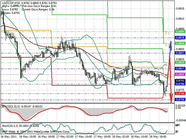 Předpokládaný pohyb pro dnešní den SHORT. Případné vstupy do obchodu z hladiny 0.884 s předpokládaným cílem 0.875, případně až 0.871. Proražení hladiny 0.884 může vést k pohybu s pravděpodobným cílem 0.887 až 0.891.