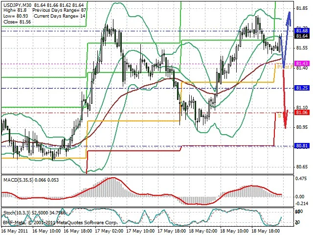 Předpokládaný pohyb pro dnešní den LONG. Případné vstupy do obchodu z hladiny 81.4 s předpokládaným cílem 81.8, případně až 81.95. Proražení hladiny 81.35 může vést k pohybu s pravděpodobným cílem 80.95 až 80.7.