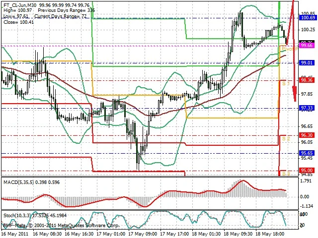 Předpokládaný pohyb pro dnešní den SHORT. Případné vstupy do obchodu z hladiny 102.3 s předpokládaným cílem 97.7, případně až 94.9. Proražení hladiny 102.3 může vést k pohybu s pravděpodobným cílem 104.75 až 106.