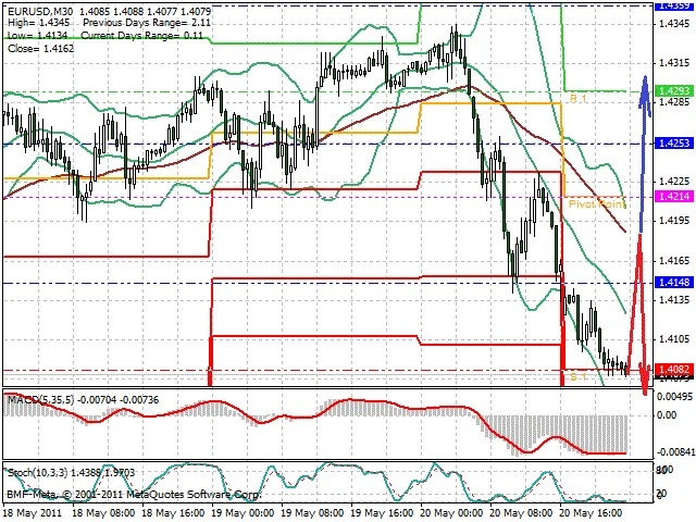 Předpokládaný pohyb pro dnešní den SHORT. Případné vstupy do obchodu z hladiny 1.419 s předpokládaným cílem 1.402, případně až 1.3955. Proražení hladiny 1.42 může vést k pohybu s pravděpodobným cílem 1.43 až 1.434.