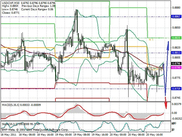 Předpokládaný pohyb pro dnešní den LONG. Případné vstupy do obchodu z hladiny 0.875 s předpokládaným cílem 0.883, případně až 0.8855. Proražení hladiny 0.875 může vést k pohybu s pravděpodobným cílem 0.871 až 0.8675.