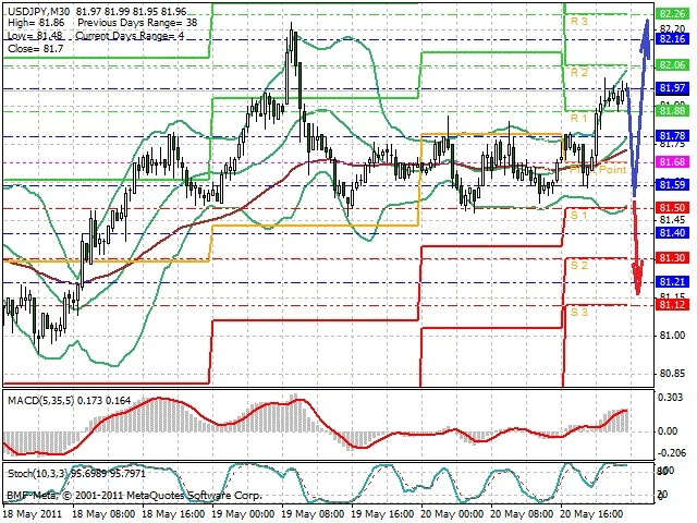 Předpokládaný pohyb pro dnešní den LONG. Případné vstupy do obchodu z hladiny 81.55 s předpokládaným cílem 82.25, případně až 82.6. Proražení hladiny 81.45 může vést k pohybu s pravděpodobným cílem 81.2 až 80.95..
