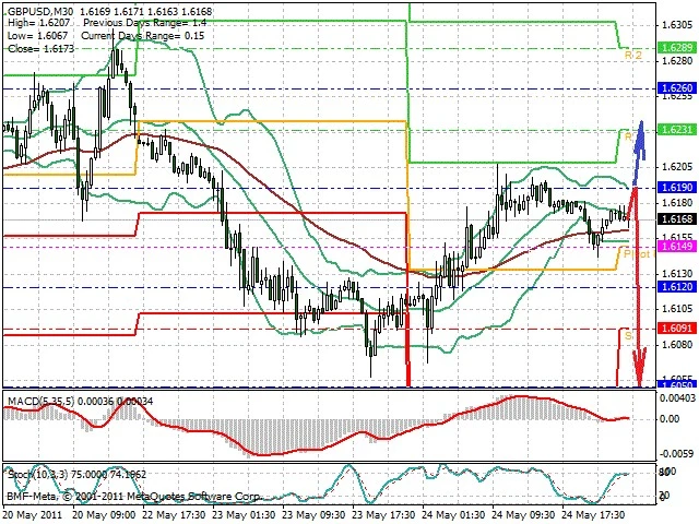 Předpokládaný pohyb pro dnešní den SHORT. Případné vstupy do obchodu z hladiny 1.619 s předpokládaným cílem 1.6055, případně až 1.603. Proražení hladiny 1.62 vést k pohybu s pravděpodobným cílem 1.6235 až 1.63.