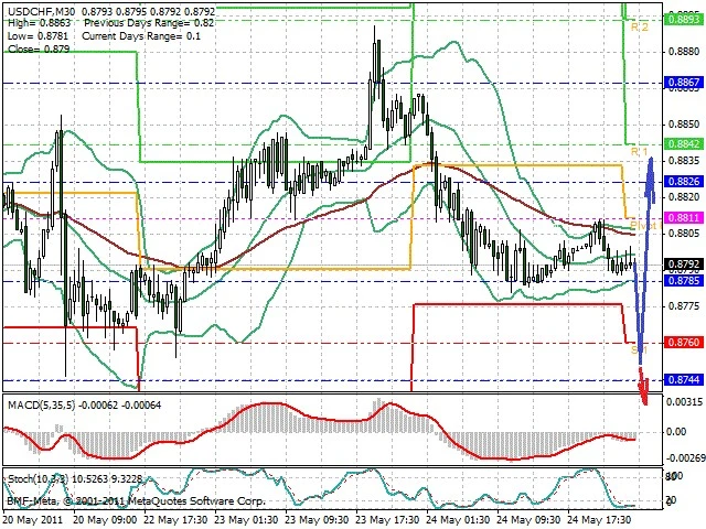 Předpokládaný pohyb pro dnešní den LONG. Případné vstupy do obchodu z hladiny 0.8755 s předpokládaným cílem 0.8835, případně až 0.887. Proražení hladiny 0.8755 může vést k pohybu s pravděpodobným cílem 0.873 až 0.871.
