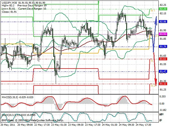 Předpokládaný pohyb pro dnešní den LONG. Případné vstupy do obchodu z hladiny 81.7 s předpokládaným cílem 82.1, případně až 82.25. Proražení hladiny 81.6 může vést k pohybu s pravděpodobným cílem 81.3 až 80.95.