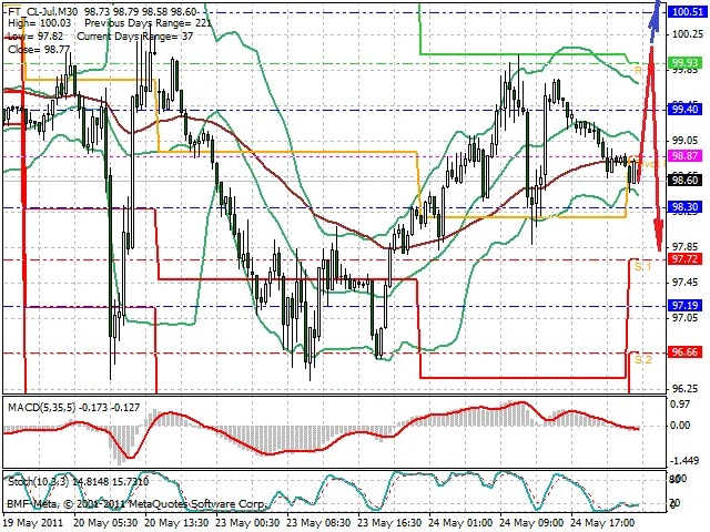 Předpokládaný pohyb pro dnešní den SHORT. Případné vstupy do obchodu z hladiny 100.2 s předpokládaným cílem 97.85, případně až 96.5. Proražení hladiny 100.2 může vést k pohybu s pravděpodobným cílem 100.7 až 101.4.