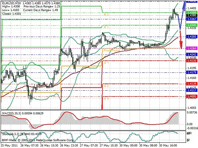 Předpokládaný pohyb pro dnešní den LONG. Případné vstupy do obchodu z hladiny 1.433 s předpokládaným cílem 1.44, případně až 1.442. Proražení hladiny 1.432 může vést k pohybu s pravděpodobným cílem 1.4265 až 1.421.