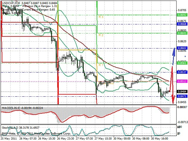 Předpokládaný pohyb pro dnešní den SHORT. Případné vstupy do obchodu z hladiny 0.855 s předpokládaným cílem 0.8465, případně až 0.843. Proražení hladiny 0.855 může vést k pohybu s pravděpodobným cílem 0.86 až 0.865.