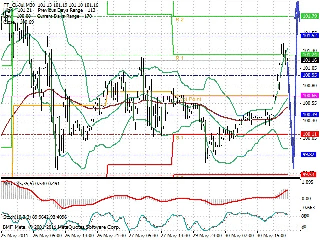 Předpokládaný pohyb pro dnešní den LONG. Případné vstupy do obchodu z hladiny 99.6 s předpokládaným cílem 102, případně až 102.8. Proražení hladiny 99.6 může vést k pohybu s pravděpodobným cílem 98.95 až 97.85.