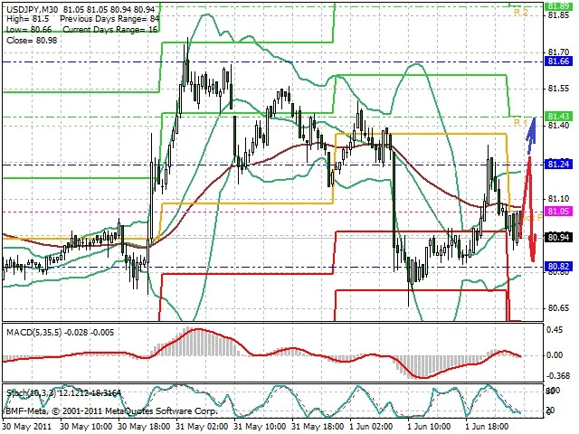 Předpokládaný pohyb pro dnešní den SHORT. Případné vstupy do obchodu z hladiny 81.25 s předpokládaným cílem 80.85, případně až 80.65. Proražení hladiny 81.3 může vést k pohybu s pravděpodobným cílem 81.4 až 81.6.