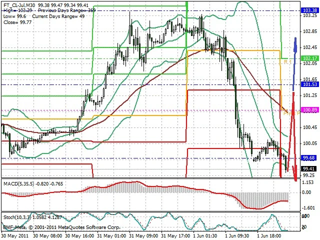 Předpokládaný pohyb pro dnešní den SHORT. Případné vstupy do obchodu z hladiny 101.45 s předpokládaným cílem 97.85, případně až 96.65. Proražení hladiny 101.45 může vést k pohybu s pravděpodobným cílem 102.75 až 103.5.
