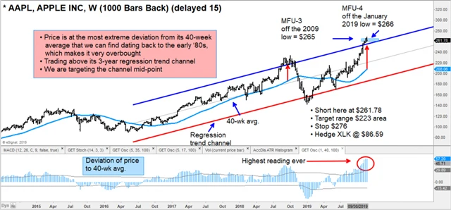 Na prvním grafu jsou akcie společnosti Apple, jejichž cena je v porovnání s 40denním průměrem na extrémních hodnotách, což znamená, že je titul silně silně překoupený. Také vidíme cílové hladiny MFU 3 (vytvořena v roce 2009) a MFU 4 (z ledna 2019) na 265, respektive 266 dolarech, a to na horní linii regresního kanálu. Doporučení je tedy prodávat na 261 dolarech s cílem na 223 dolarech.