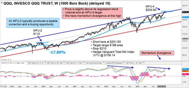 Na druhém grafu je vývoj ETF sledujícího index Nasdaq 100. Cena dosáhla cílové hladiny MFU 4 a překonala horní linii regresního kanálu. Zároveň se vytvořila divergence na indikátoru MACD, takže doporučení je prodávat na 201 dolarech s cílovou cenou 186 dolarů.