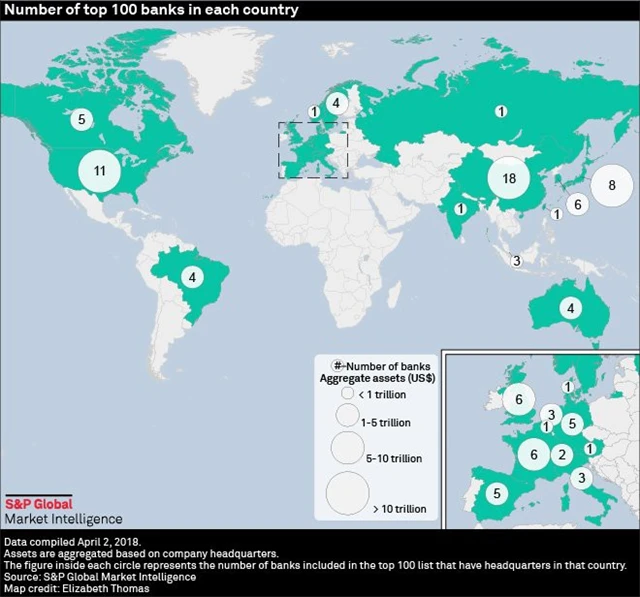 Z regionálního hlediska je v seznamu sta největších bank podle hodnoty aktiv ve správě nejčetněji zastoupená Evropa, následují Čína a Severní Amerika. První čtyři příčky v žebříčku patří Číně, konkrétně gigantům Industrial & Commercial Bank of China, China Construction Bank, Agricultural Bank of China a Bank of China.