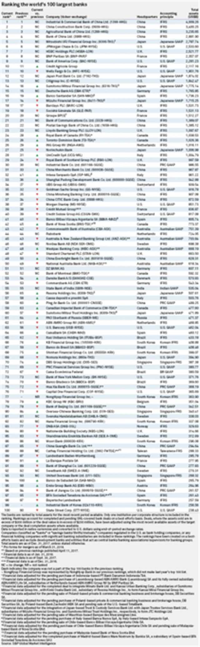 V předchozím žebříčku (za rok 2016) byly mezi deseti největšími bankami světa tři američtí zástupci, nyní ale francouzská Crédit Agricole na desáté příčce vystřídala finanční dům Wells Fargo.