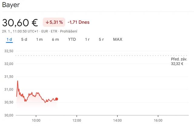 Akcie společnosti Bayer během pondělního dopoledne klesaly až o 5,43 %.