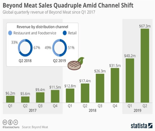 Firma Beyond Meat vyrábí řadu produktů rostlinného původu, které mají věrně nahrazovat masné produkty. Jako jediná veřejně obchodovaná společnost podnikající čistě v této oblasti se veze na trendu zdravější stravy a šetrného přístupu ke zvířatům a životnímu prostředí. Tato vlna se však liší od předchozích vegetariánských alternativ, jelikož cílí na to, aby vypadala jako maso, chutnala jako maso a kupovali ji konzumenti masa, nikoli pouze vegetariáni. To otevírá nové možnosti.