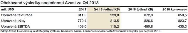 "Očekáváme, že loni upravené tržby vzrostly o 5,9 % na 825,7 milionu USD. Tahounem růstu byl podle nás nadále segment spotřebitelského antiviru pro PC. Upravený zisk před odpisy EBITDA očekáváme na úrovni 450,2 milionu USD (+7,3 %) a EBITDA marži 54,5 % (o rok dříve 53,8 %)," uvedl Pavel Ryska z J&T Banky. "Marže podle nás meziročně vzroste hlavně díky dozvuku synergií z akvizice AVG Technologies. Management podle nás představí návrh na výplatu první dividendy od vstupu na burzu. Čekáme 0,064 USD na akcii (0,049 GBP, 1,46 Kč) ze zisku za rok 2018. Podstatný bude výhled společnosti, především to, zda firma udrží vyšší jednociferné tempo růstu tržeb."