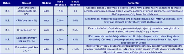 Důležitá makrodata budou v týdnu vycházet také v Česku. V pondělí se trh zaměří na obchodní bilanci a inflaci. Podle analytiků oslovených ČTK v únoru spotřebitelské ceny vzrostly o 2,6 % po lednovém růstu o 2,5 %, a to hlavně kvůli cenám energií. "Významnější příspěvek do celkové inflace lze očekávat i od alkoholu a tabákových výrobků a kladně by měly po odmlce začít opět přispívat i potraviny," uvedl hlavní ekonom společnosti AKCENTA CZ Miroslav Novák. Podle ekonomky z Komerční banky Moniky Junicke v březnu a dubnu inflace ještě zrychlí a mohla by se dostat až k 3% hranici. Ve čtvrtek vyjdou ještě statistiky maloobchodních tržeb a v pátek budou oznámeny stavební a průmyslová výroba a také bilance běžného účtu.