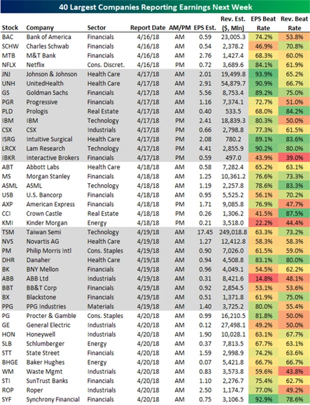 40 největších firem v USA, které zveřejňují výsledky v týdnu od 16. dubna 2018, zdroj: Bespoke Investment Group