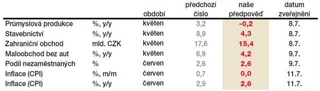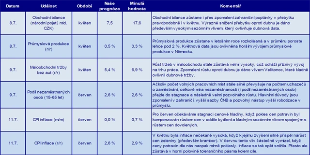 Na makrodata bohatý bude týden v České republice. V pondělí vyjdou obchodní bilance a také průmyslová a stavební výroba, v úterý maloobchodní tržby, míra nezaměstnanosti a devizové rezervy a ve čtvrtek spotřebitelská inflace. "Květnové maloobchodní tržby i tempo dovozů potvrdí, že se spotřebitelská poptávka drží na solidních hodnotách i ve druhém čtvrtletí. Naopak průmysl zkorigoval předchozí růst, což se negativně odrazí na květnové dynamice exportů. Inflace podle všeho zpomalila o tři desetiny procentního bodu na +2,6 % poté, co v červnu vylétla výše," napsali ekonomové z Komerční banky.