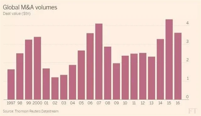 Aktivita v oblasti fúzí a akvizicí letos vyvrcholila ve čtvrtém čtvrtletí, ve kterém hodnota dohodnutých transakcí dosáhla 1,2 bilionu dolarů. Přispěla k tomu kromě jiného říjnová dohoda americké telekomunikační společnosti AT&T o převzetí mediálního konglomerátu Time Warner v celkové hodnotě 108 miliard dolarů, jež kompenzovala jistý útlum v akvizičních aktivitách čínských podniků, píše Financial Times.