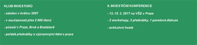 Již poosmé se na půdě Vysoké školy ekonomické v Praze uskuteční Investiční konference pořádaná Klubem Investorů. Letos se můžete mimo jiné těšit na Leoše Novotného, zakladatele společnosti Leo Express, a Tomáše Baču, zakladatele společnosti EYELEVEL.