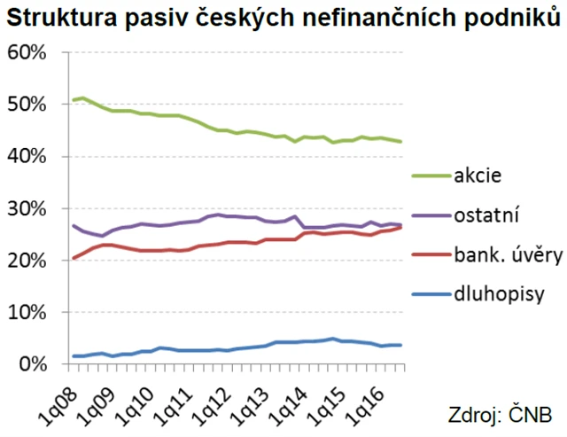 Dnes, v prostředí extrémně nízkých úrokových sazeb, zmíněná fakta zřejmě nikoho vyloženě netrápí. Podíl dluhopisů na celkových pasivech českých nefinančních podniků po mírném růstu v letech 2008-2014 začal před dvěma lety dokonce klesat. Firmy si mnohem raději půjčují nejen od bank, ale i od svých dodavatelů (skrze obchodní úvěry, které jsou hlavní složkou kategorie "ostatní"). Ale časy se změní. První růst sazeb ČNB očekáváme zhruba do dvou let. Pak možná leckomu začne být pomalého postupu kapitálové unie líto.