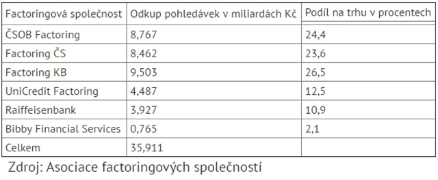 Lídrem trhu byl ve čtvrtletí Factoring KB. Společnost vykázala u odkoupených pohledávek obrat 9,5 miliardy korun. Následují Factoring ČSOB s 8,8 miliardy korun a Factoring ČS s 8,5 miliardy korun.