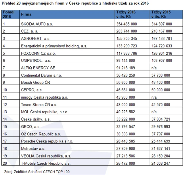 Tržby stovky největších tuzemských firem loni meziročně stouply o 10,6 procenta na 2,6 bilionu korun. Jejich zisky vzrostly o 4,5 procenta na 188 miliard korun. Nejvyšší příčky žebříčku Czech Top 100 opět obsadily Škoda Auto, ČEZ a Agrofert. Mladoboleslavská automobilka zvítězila v žebříčcích nejvyšších tržeb i nejvyšších zisků. Sdružení Czech Top 100 to v úterý oznámilo v tiskové zprávě.
