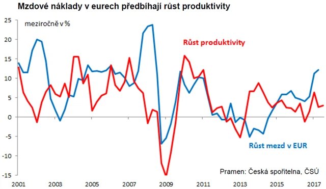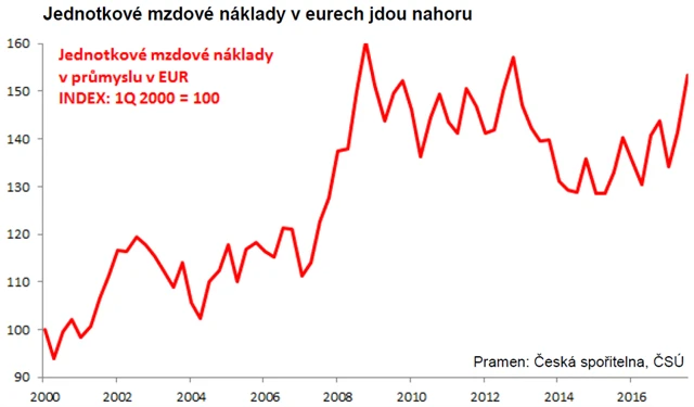 Pohled na vývoj pracovních nákladů v eurech vyvolává směs pocitů. Nejprve ta horší zpráva (z pohledu exportérů) – pracovní náklady v eurech celkem rychle rostou. Mzdy v průmyslu se ve třetím kvartálu zvýšily meziročně o 7,5 % a koruna je ve srovnání s eurem silnější o více než 4 %.