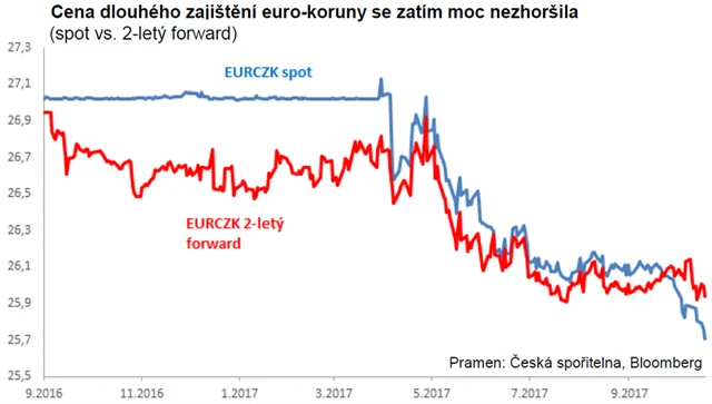Při pohledu na spotový kurz EUR/CZK v posledních týdnech asi zapochybujete, že tohle je ta dobrá zpráva. Ano, spotový kurz je z pohledu (nezajištěného) exportéra stále horší, ale zajišťovací (forwardový) kurz na dva až tři roky dopředu se od léta příliš nezhoršil. Je dokonce pouze o několik desítek haléřů horší než několik posledních měsíců před koncem kurzového závazku ČNB.