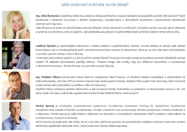 Hosté TQL Day vám na setkání nabídnou jiný pohled na osobní i profesní bloky a poradí vám, jak s nimi jednou provždy zatočit. Dále vám doporučí, jak můžete posílit své postavení a upevnit vztahy s obchodními partnery a klienty, a také nabídnou vhled do současné globální ekonomiky a poradí, jak se zajistit pro aktivní život v důchodovém věku.