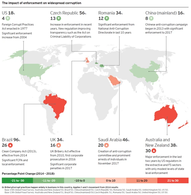 Zavádění a vymáhání protikorupčních opatření může mít v různých zemích odlišné dopady. Stejné údaje ukazují výrazné zhoršení u zemí, jako je Velká Británie, kde počet respondentů přesvědčených, že korupce je v tamním podnikání široce rozšířena, stoupl ze 14 % na 34 %. Obdobné zhoršení vnímání problematiky korupce lze zaznamenat například v Kanadě (nárůst ze 14 % na 30 %) či v Austrálii a na Novém Zélandu (ze 14 % na 38 %).