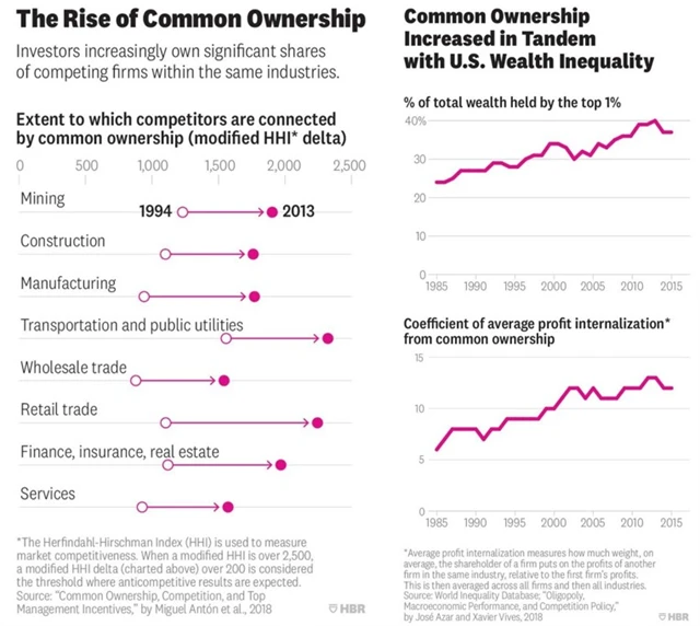 Harvard Business Review se nedávno zaměřil na spojitost mezi růstem koncentrace korporátní síly v rukou několika velkých hráčů a růstem obliby investování do indexových fondů. A dospěl k závěru, že nárůst počtu investorů, kteří najednou vlastní podíly v několika společnostech v jednom odvětví, vede k oligopolizaci odvětví a omezování prostoru pro vznik plnohodnotné konkurence.