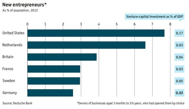 Ve Spojených státech zhruba každý třináctý občan podniká. To je třikrát více než v Německu, které chce USA konkurovat jako ráj start-upů. Z hlediska podílu rizikového kapitálu na HDP je na tom Německo ještě hůře. Švédsko a Francie mají například stejný podíl podnikatelů, Švédsko má však otevřenější kapitálové kohoutky. A ačkoli podíl podnikatelů na populaci v Nizozemsku je oproti Francii a Švédsku dvojnásobný, jeho investice do rizikového kapitálu jsou stejně nízké jako ty francouzské. Německo tak jako konkurent Spojených států v oblasti produkce start-upů stojí před jednou velkou překážkou - investice do rizika jsou desetkrát nižší než v USA.