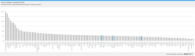 Žádná z těchto tří zemí není "nejlevnější" ani v případě vynutitelnosti kontraktů. V tomto případě dosahují náklady více než 20 % výše pohledávky.