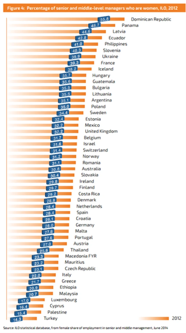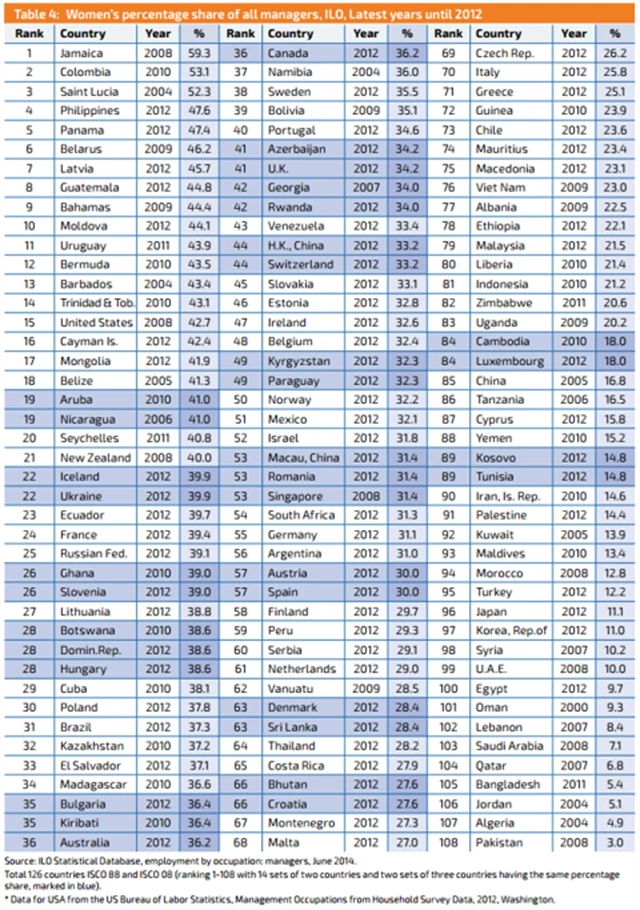 Na Jamajce je podle ILO zhruba 60 % všech vedoucích pracovníků ženského pohlaví. Kolumbie, země s druhým největším podílem šéfek, se chlubí úctyhodnými 53 %. U Svaté Lucie to je 52,3 %. Hned další v řadě jsou Filipíny, kde je 48 % manažerek ženského pohlaví, a Bělorusko s 46 %. USA jsou na seznamu patnáctkou se 43 % manažerek. Nejméně rovnoprávné jsou (podle očekávání) islámské země Jemen, Pákistán a Alžírsko, kde šéfují ženy jen ve 4,9 %, respektive 3 % a 2,1 % případů. Zbytek spodní desítky patří zemím Blízkého východu a severní Afriky. Tabulka zahrnuje údaje pro všechny sledované země ILO.