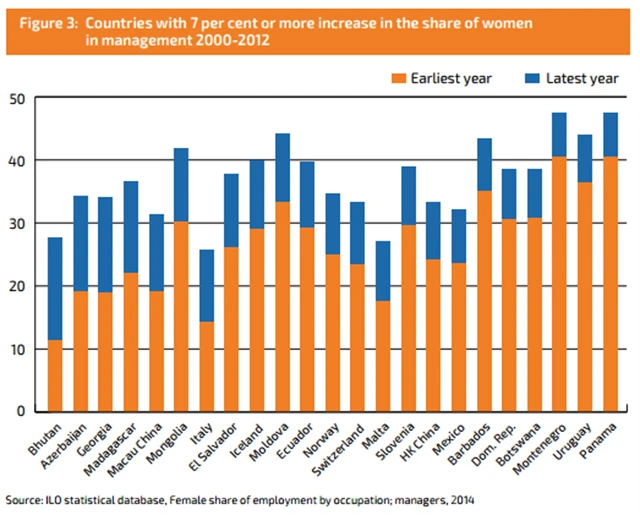 Trend růstu podílu zaměstnaných žen je ale příznivou zprávou, 40 % je velké zlepšení oproti minulosti. Ženy představují čtvrtinu všech zaměstnavatelů světa, když odečtete Blízký východ a severní Afriku, kde je podíl jen 6 %. A počet manažerek rapidně vzrůstá - v téměř 80 % zemí vzrostl podíl od roku 2000 a ve 23 zemích šlo o růst o 7 a více procentních bodů.